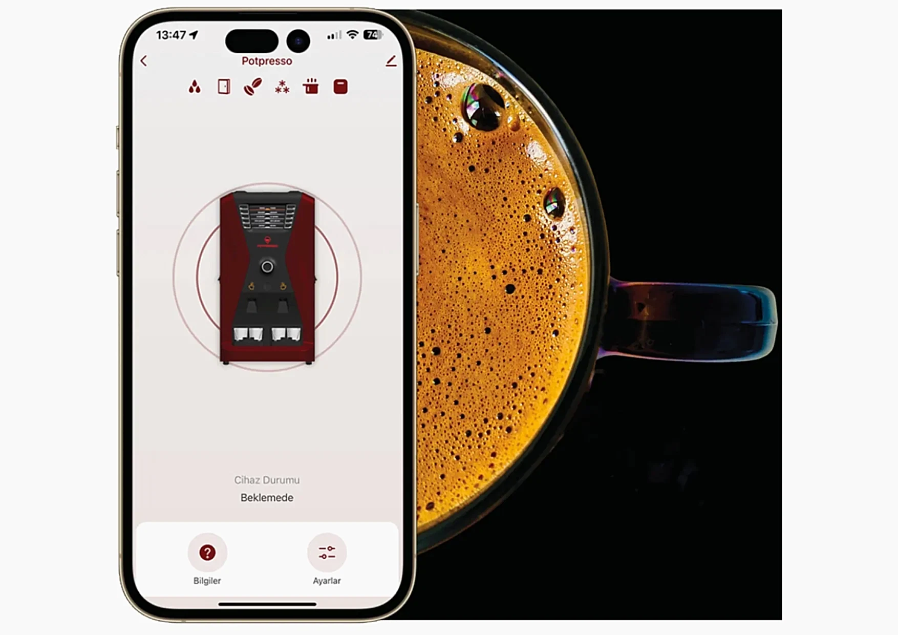 Mobil uygulama entegrasyonu ile işletmelerin kahve servisini daha verimli hale getirir. Bu özellik sayesin- de kahve makinasınının tüm verileri uzaktan takip ve kontrol edilebilir, ayarlamalar yapılabilir ve hatta uzaktan kahve siparişi verilebilir. Bu, kafe sahiplerine ve işletmelerine müşteri memnuniyetini artırmak, işletme verimliliğini yükseltmek ve kahve servisi süreçlerini takip ve optimize etmek için imkan sunar.